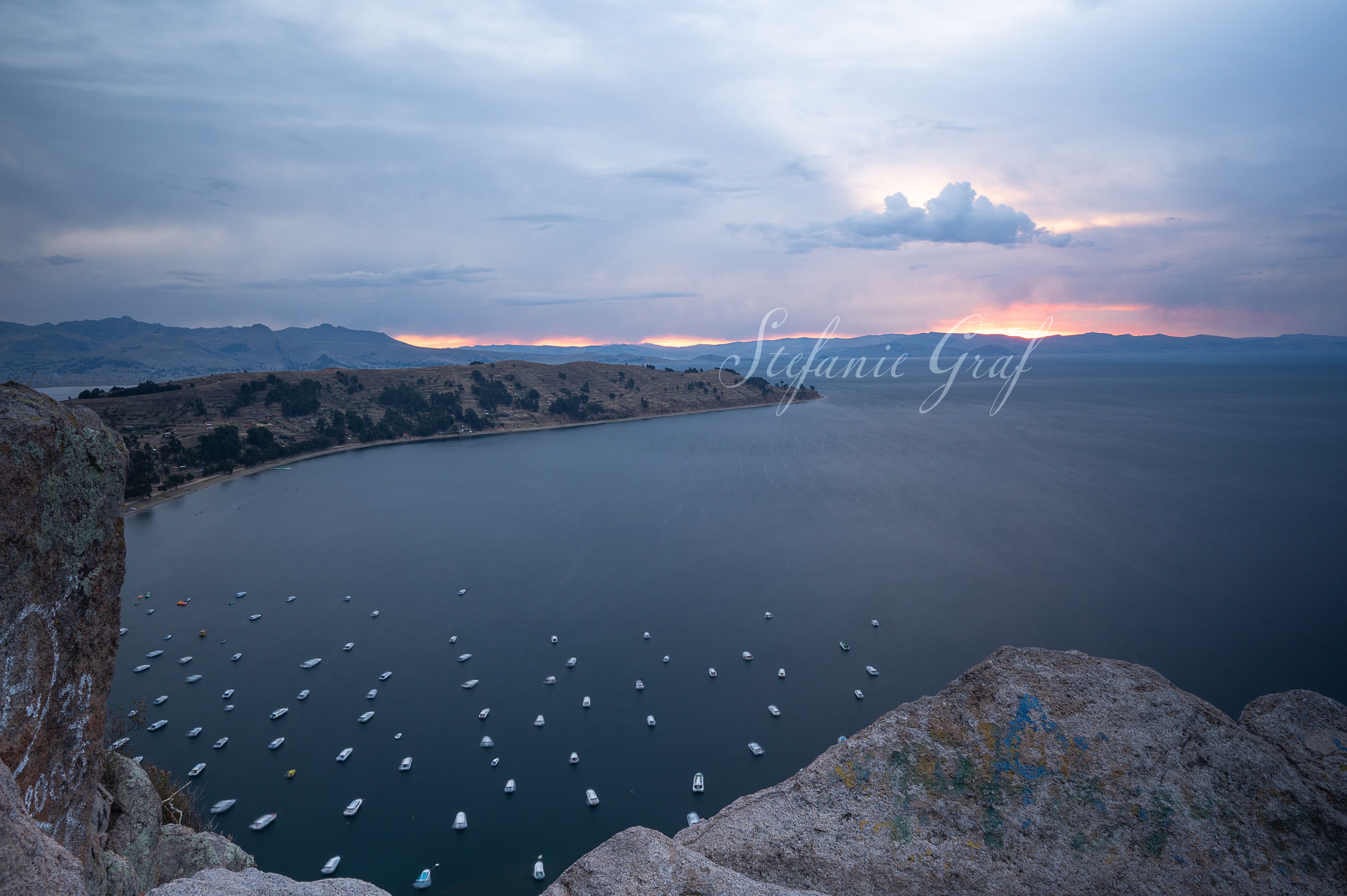 Nach einem entspannten Aufstieg auf den heiligen Berg der Inka in Copacabana erreichten wir den Gipfel pünktlich zum Sonnenuntergang. Nicht nur wir waren angekommen - auch alle Boote haben bereits den Anker geworfen. Das Bild sieht friedlich aus, auch in diesem Bild trügt der Schein. Direkt neben der untergehenden Sonne baute sich ein starkes Gewitter auf. Wir schafften es gerade noch rechtzeitig nach unten, um dem Gewitter auf ungefähr 4000 m über dem Meeresspiegel beim Abendessen in einem Restaurant zuzuschauen.